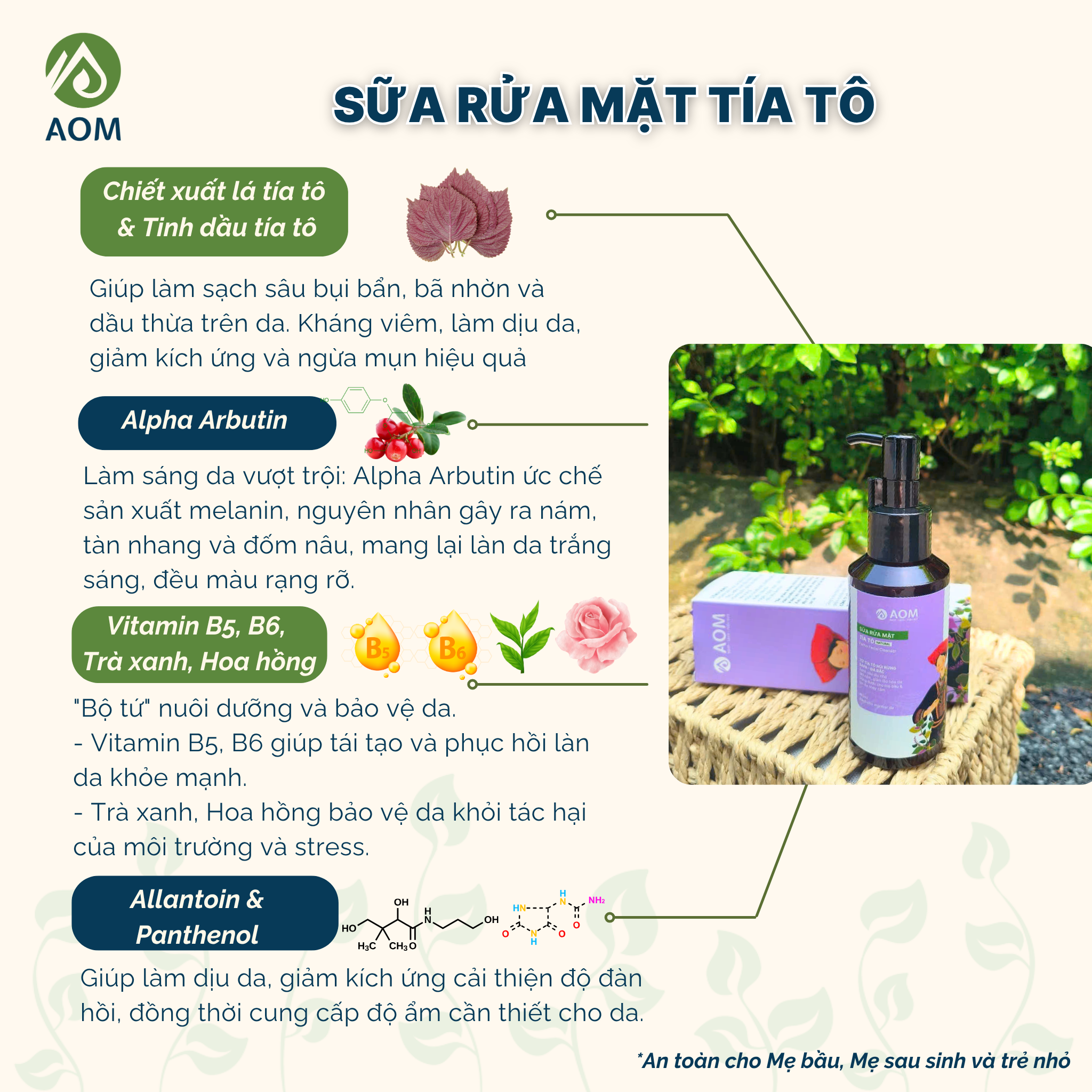 Sữa rửa mặt tía tô AOM có các thành phần nguyên liệu từ thiên nhiên như: bột tía tô, bột giảo cổ lam, bột trà xanh, tinh dầu tía tô,… Sữa rửa mặt tía tô giúp làm sạch sâu, loại bỏ bụi bẩn, tẩy tế bào chết và bã nhờn. Từ đó khiến cho làn da giảm các tình trạng mẩn ngứa, chống lão hóa da và làm da bạn sáng lên một cách tự nhiên.