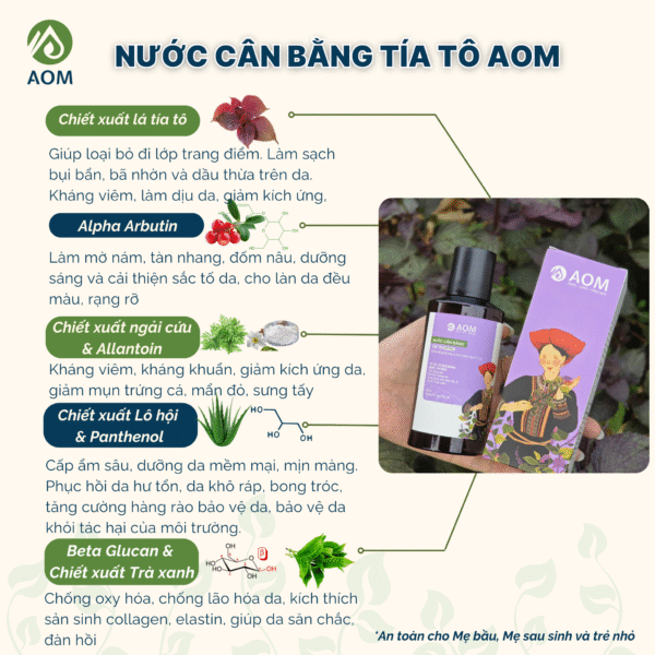 Nước cân bằng của AOM được chiết xuất với các thành phần từ nguyên liệu tự nhiên, đảm bảo an toàn và hiệu quả tốt nhất: